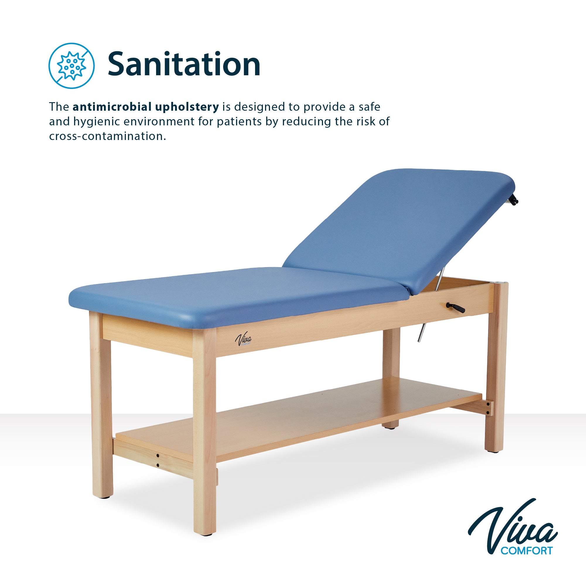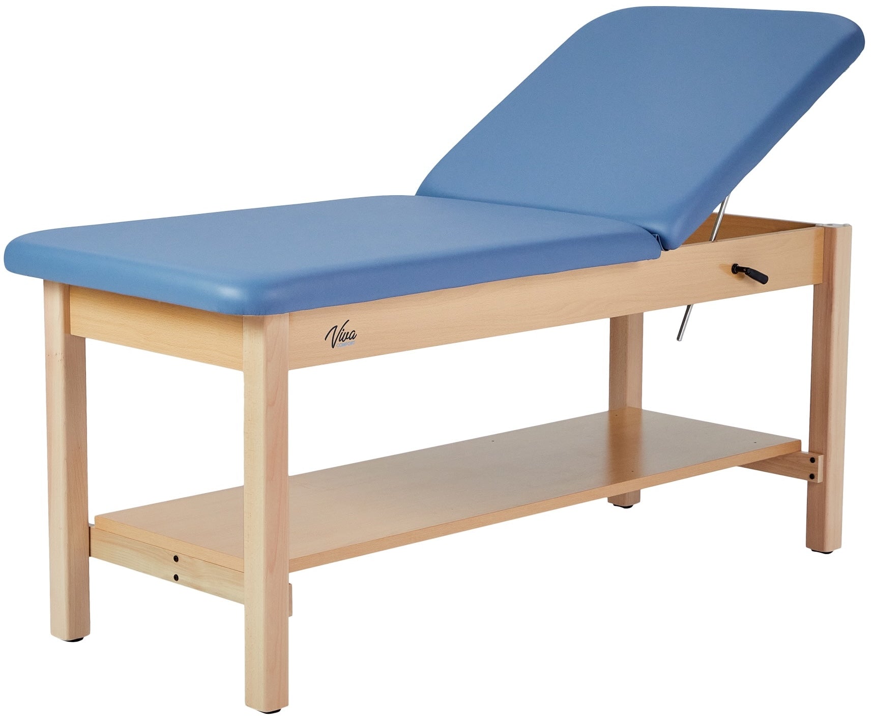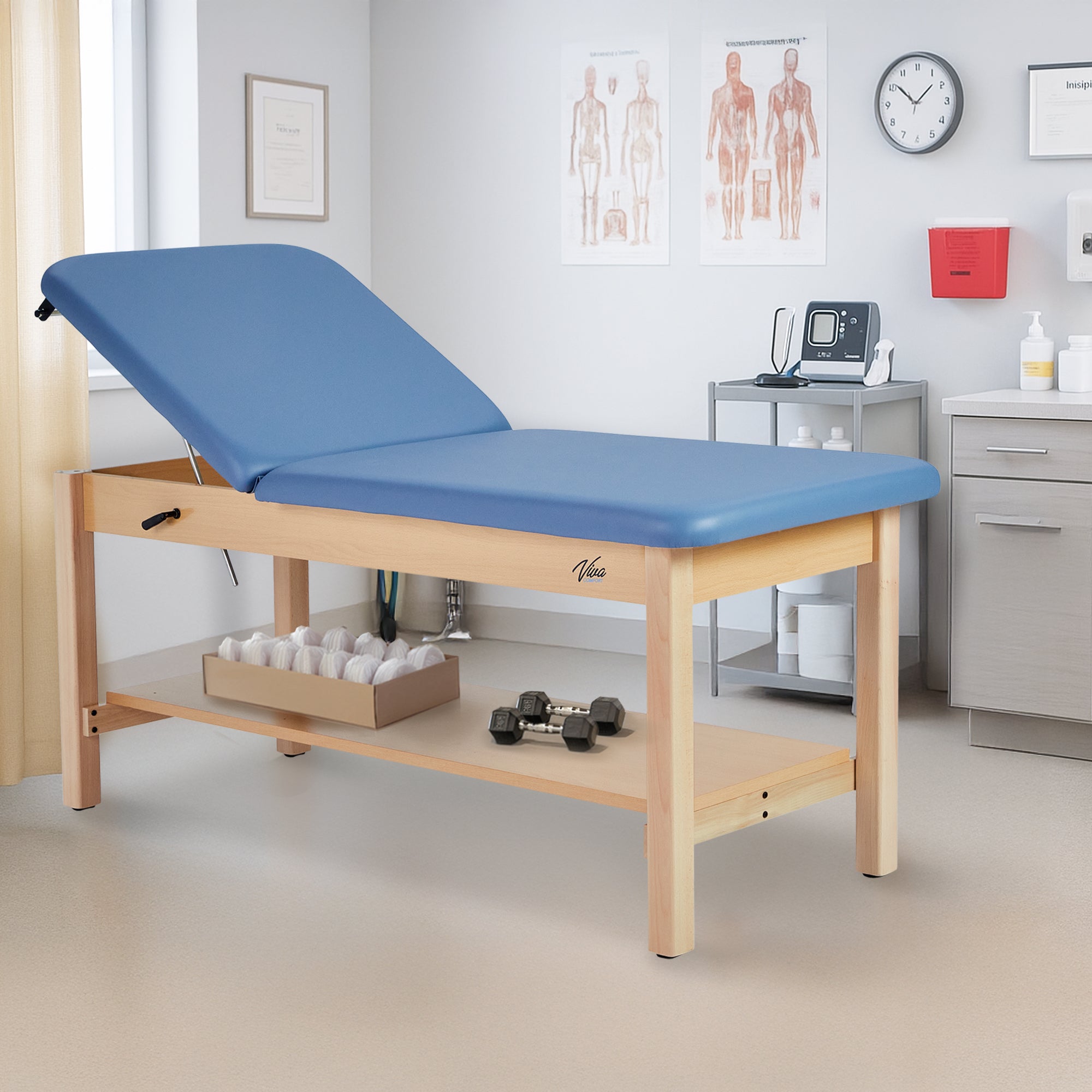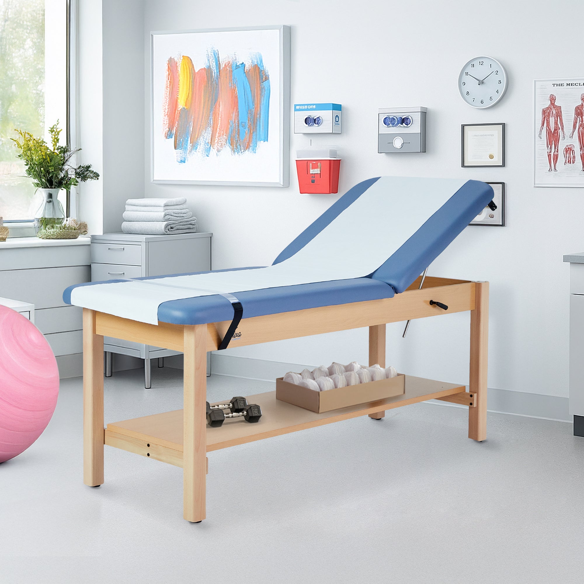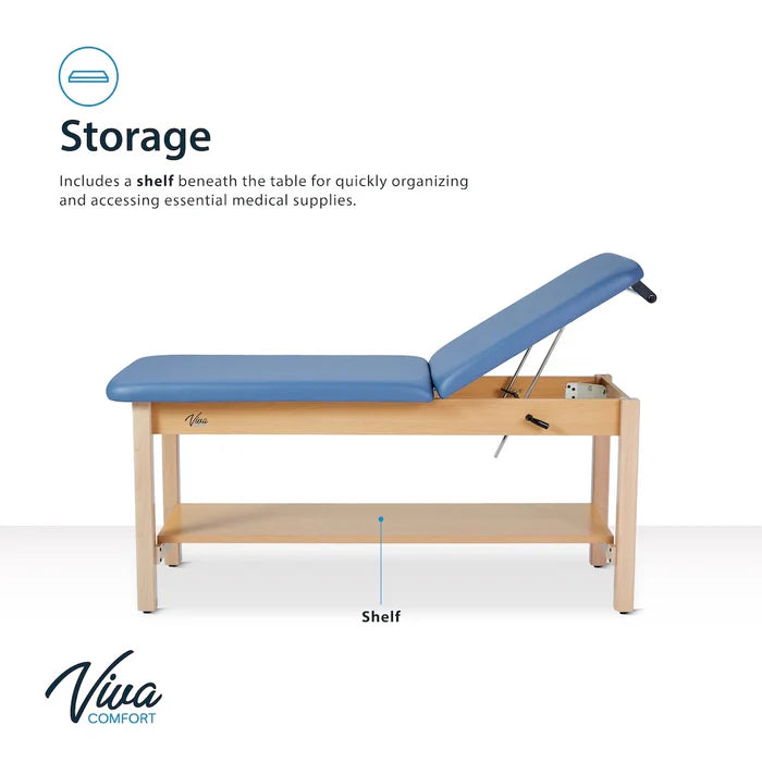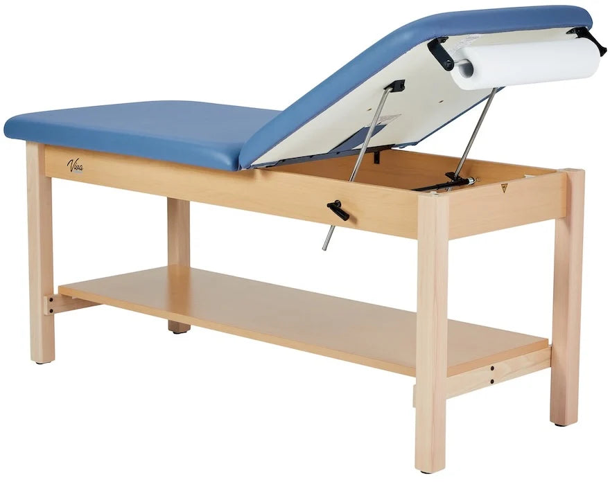 Indulge in comfort and efficiency with our Aristo H-Brace Tilted Treatment Table. Our treatment table's design will heighten your professional space and exude professionalism. Not only does it have an array of features and compatible accessories, but the finished wood and plush mattress immediately provide a sense of reassurance for patients. Its adjustable backrest offers unparalleled versatility, allowing customization from 0 to 67 degrees. This ensures optimal positioning for various treatments and examinations. Its sturdy wooden base, coated with a natural clear PU paint, not only exudes modernity but also ensures long-lasting durability. Patients will experience sublime relaxation on the 2-inch-thick antimicrobial mattress with rounded corners, offering comfort and hygiene in equal measure. The antimicrobial upholstery will ensure sterilization between patients and can be easily sanitized. These exam tables are engineered to accommodate up to 500 lbs. and fortified by a support brace for added stability, instilling confidence in their reliability.